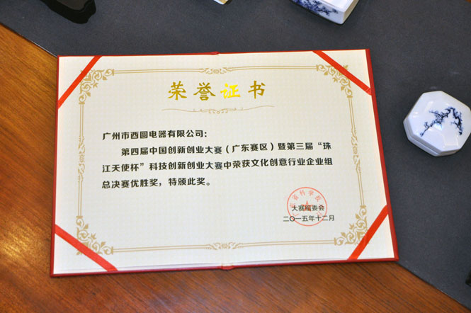 廣州市酉圓電器有限公司參加2015年度第四屆中國創(chuàng)新創(chuàng)業(yè)大賽,參賽組別為文化創(chuàng)意行業(yè)企業(yè)組,經(jīng)過將近五個月的比賽,歷經(jīng)廣州市初賽、廣東省半決賽和廣東省總決賽的激烈角逐,最終酉圓電器在廣東省暨第三屆“珠江天使杯”科技創(chuàng)新創(chuàng)業(yè)大賽文化創(chuàng)意行業(yè)企業(yè)組總決賽中榮獲《優(yōu)勝獎》榮譽,此份榮譽是酉圓在文化創(chuàng)意領(lǐng)域的實力見證。
